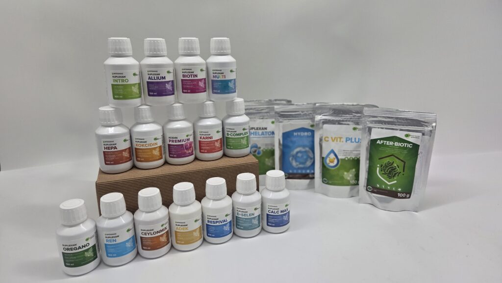 Problemy układu pokarmowego to codzienność w chowie przyzagrodowym, zwłaszcza przy zmiennej jakości paszy i wody. Tutaj szczególnie pomocne są środki zakwaszające przewód pokarmowy, takie jak Acidin Premium, który ogranicza namnażania bakterii patogennych w przewodzie pokarmowym i poprawia strawność paszy. Współdziała on z preparatami witaminowymi, takimi jak kompleksowy preparat witaminowy Suplexan Multi czy Suplexan ADEK, które pozwalają uzupełnić niedobory żywieniowe i zapewniają prawidłowy rozwój ptaków. Witaminy A, D₃, E i K wspierają odporność, kościec, jakość upierzenia i zdrowie układu krążenia, co szczególnie widać w okresie intensywnego wzrostu czy w pierwszych tygodniach życia kurcząt.